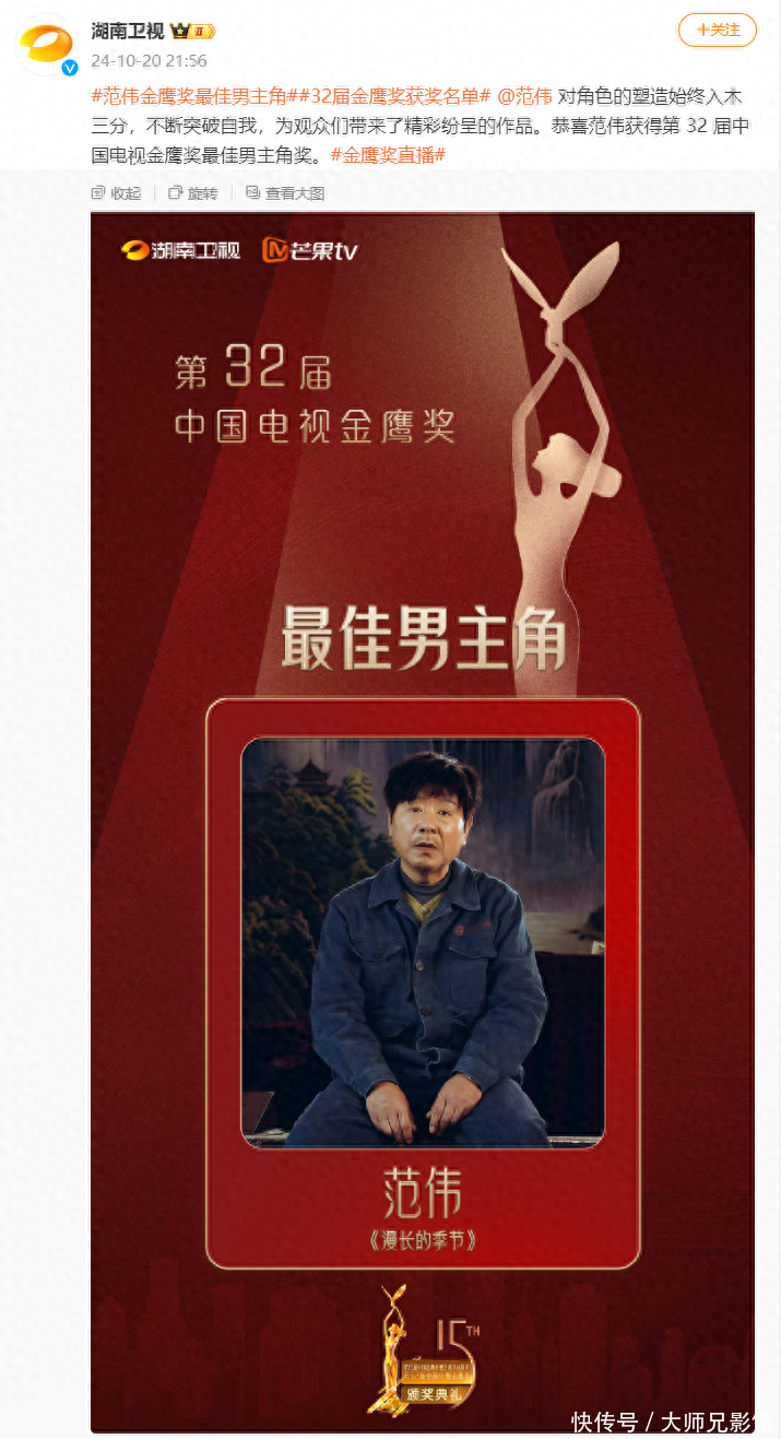 范伟对变装的塑造永恒言不虚发,抑止冲突自我,为不雅众们带来了精彩纷呈的作品。恭喜范伟赢得第32届中国电视金鹰奖最好男主角奖。